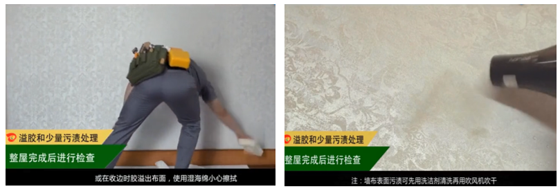施工后用強光手電筒開始自檢,重點檢查接縫和陰陽角,如有氣泡、墻布脫層、起皺、小顆粒等情況及時處理。如有刮不平的折皺,可以用蒸汽熨斗熨平,不適合用刮板刮平的產品,應用毛刷來刮平處理。